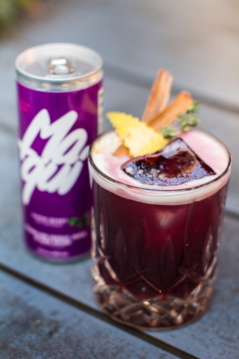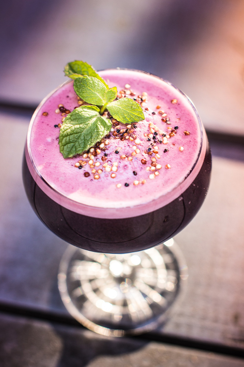 Agregar todos los productos en una coctelera. En vez de agregar el jugo de frutos rojos se agrega una onza de néctar de +maqui. Servir en una copa, adornar.