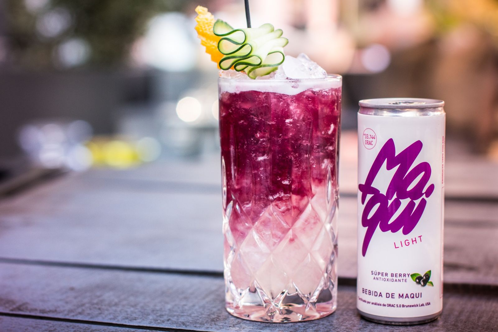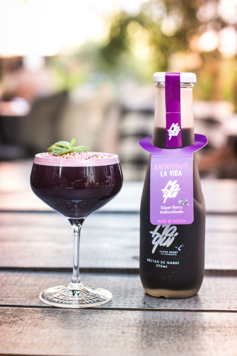 Incorporar todos los ingredientes en una coctelera ( menos el +maqui). Batir y servir en una copa, finalizar rellenando con +maqui en la copa.