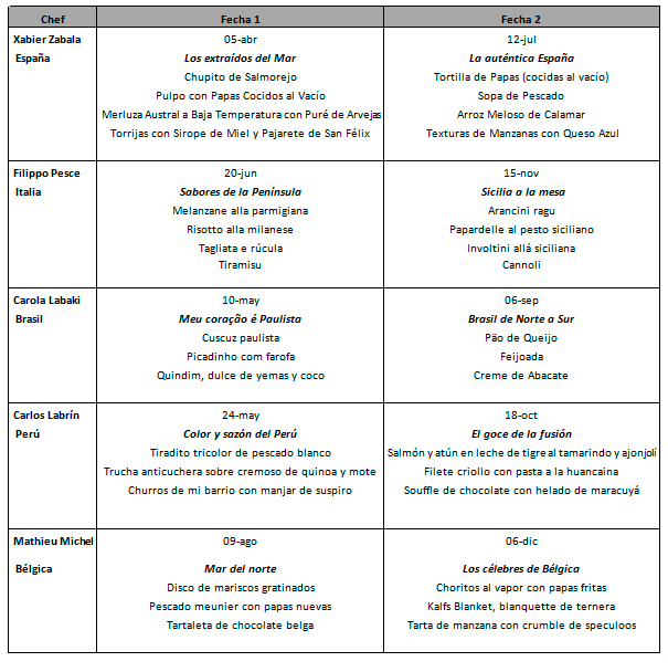 Materias primas de primer nivel y las más refinadas técnicas de la cocina internacional, serán parte del nuevo ciclo “Mundo Gourmet, Cocinas del Mundo 2017” en el nuevo showroom de Miele Experience Center. Las clases de alta gastronomía reunirán a cinco reconocidos exponentes de la cocina gourmet: Xabier Zabala (España), Filippo Pesce (Italia), Carola Labaki (Brasil), Carlos Labrín (Perú) y Mathieu Michel (Bélgica).