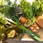 Ajo rosado, ajo chilote, salvia, romero, cilantro, perejil, espinacas, alcachofas, lechugas verdes, rojas crespas y lisas, rúcula, kale azul, albahaca, rabanitos, menta, melisa, hierba maggi, tomillo, matico, hinojo, zanahoria, frambuesa y habas salidas de la huerta.