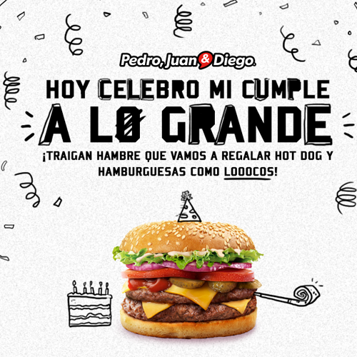 Para comenzar a festejar desde ahora debes estar atento al fan page de Pedro, Juan & Diego (www.facebook.com/pedrojuandiegochile), e inscribirte. Así podrás ganar uno de los 5.000 productos gratis (2.500 hamburguesa doble gigante en cualquiera de las variedades Pedro, Juan o Diego y 2.500 hot dogs de 22 centímetros de las variedades Completo, Italiano o Dinámico).