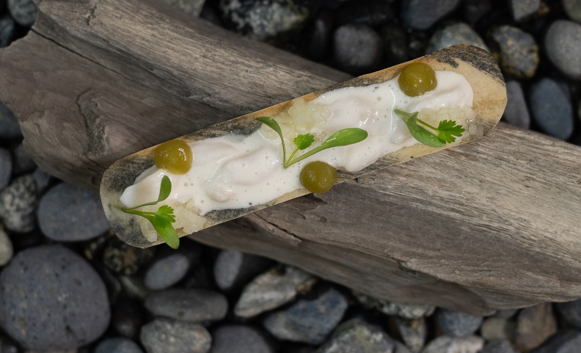 El plato que está desarrollando consiste en navajuelas en su vinagreta con manzana encurtida, gel de apio y brotes de cilantro, junto a caracol de mar con alcachofa, nabo encurtido, capuchina, flor de borraja y espuma de almeja, acompañado con caldo de cocción de mariscos y aceite de cilantro.