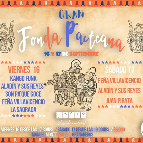 La Fonda Pacteana se realizará los días viernes 16 y sábado 17 de septiembre desde las 17:30 horas el viernes y desde las 19 horas el sábado. Durante esta instancia única, Pacto contará con una pista de baile para que todos sus asistentes puedan disfrutar de cuecas y enaltecer las tradiciones chilenas junto a la música en vivo de Kango Funk, Aladín y sus Reyes, Son pa’ que goce, Feña Villavicencio, La Sagrada, Juan Pirata y más por confirmar.