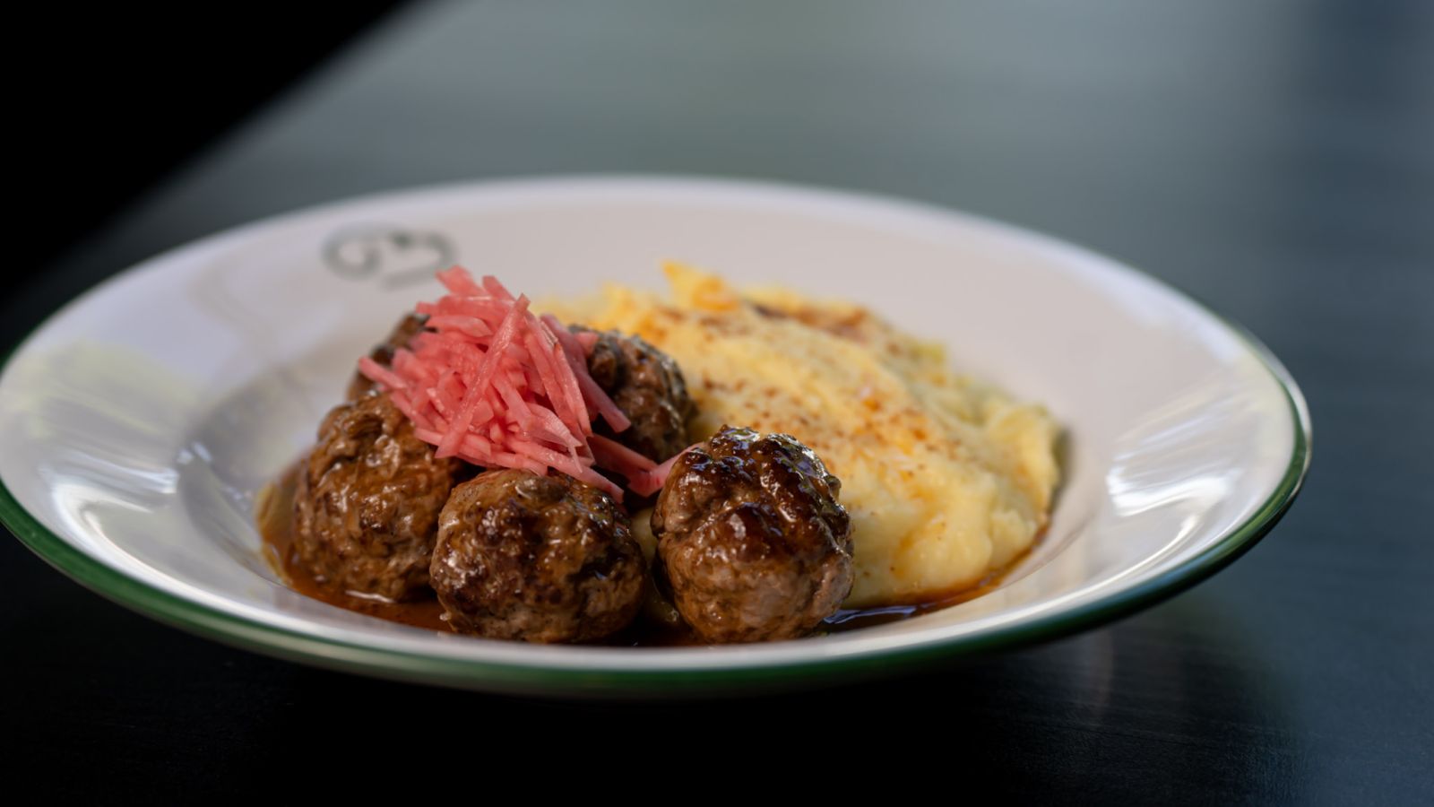 albóndigas de res con puré, la merluza austral, la ensalada césar o el sándwich de porchetta en focaccia.