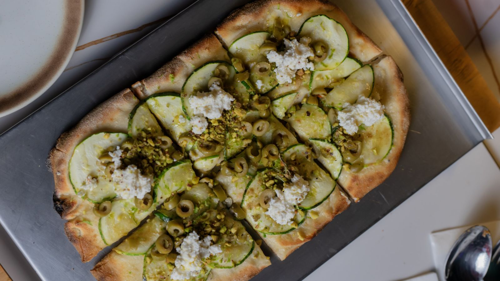 Pizza al Limón, con una base de crema trufada, rodajas de zucchini, pistacho molido, aceitunas sevillanas y un toque de zeste de limón que aporta un toque justo de acidez y frescura. Si de endulzar el momento se trata, el local recomienda el