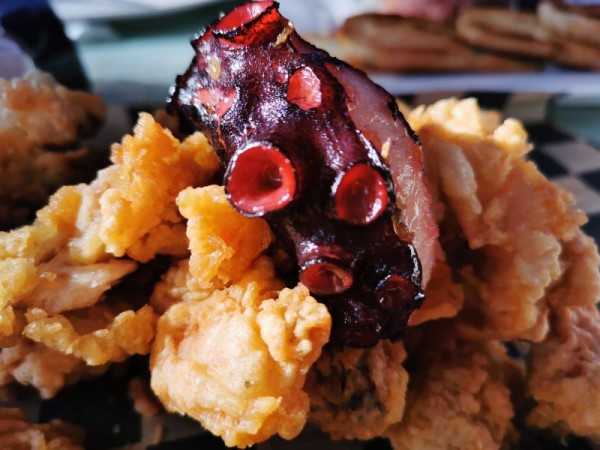(Pulpo a la parrilla con chicharrones de mariscos)