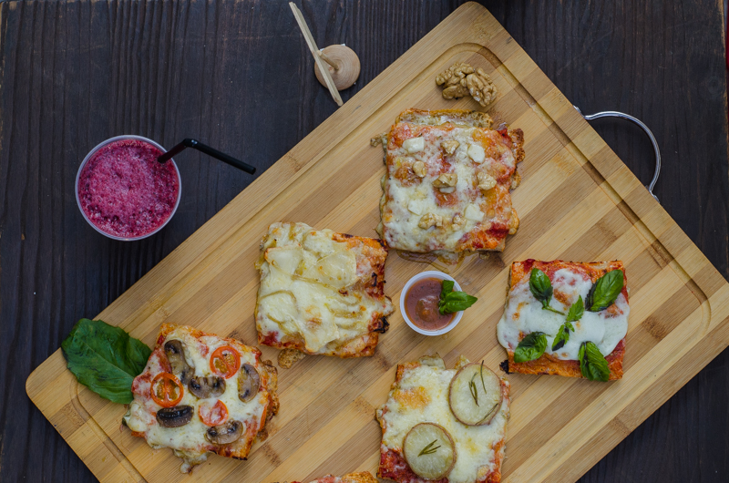 Entrando a este espacio “gastronómico-mafioso”, fuimos atendidos muy cordialmente por las chicas que acompañan a Renata, sirviéndonos los jugos estrella de La Mafia Pizzería: Giallo (maracuyá, piña, mango y durazno) y Rosso (arándano, frambuesa, frutilla y uva) ambos deliciosos, que acompañaron a los Palitos de ajo con salsa de tomate y albahaca y unas Focaccias (con y sin aceite de trufa). Comenzamos muy bien, para proseguir con los icónicos trozos de pizza: Mozzarella de Bufala (mozzarella fresca hecha con leche de Bufala); pizza de salsa, mozzarella fior di latte, queso de cabra, miel y nueces (magnífica); pizza con papa y romero; pizza camembert-cebolla, pizza pimentón-alcaparra, y la clásica margherita con salsa, mozzarella fior di latte, tomates cherry y albahaca. Realmente sabrosas, generosas y contundentes, perfectas para acompañar con juguito natural o té frío.