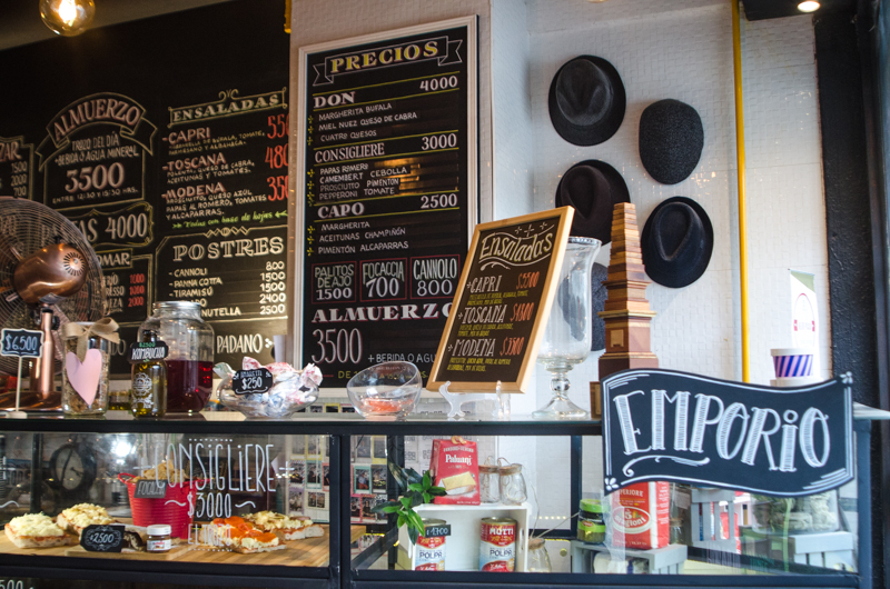El espacio en sí es pequeño y precioso, con muchos detalles decorativos que destacar: un gran mural con personajes de “la mafia” disfrutando un trozo de pizza (incluida Renata), sombreros, pizarras con lindas tipografías, un emporio con productos como harina italiana, pastas, queso grana padano y parmesano, pesto, salsa de tomates, amaretti, chocolates, todo 100% italiano, y un gran cuadro de “El Padrino” (la película) que recibe a todos sus visitantes.