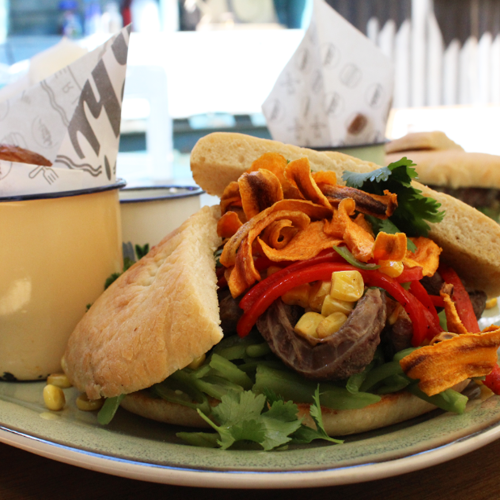 Por otro lado, era justo y necesario probar “El de Cazuela”. Un osobuco sobre porotos verdes, acompañado de choclo, pimientos asados y novedosos chips de zanahoria y zapallo camote. Además, viene con una taza en donde está su caldito, para poder untar un trozo del sánguche o rociarlo encima del mismo o bien tomártelo, tú decides. Este sánguchito que se presenta tan bonito y colorido frente a nosotros es realmente como meterse una cucharada de cazuela a la boca. Cierra los ojos y haz la prueba. Casi no te das cuenta que es un sánguche.
