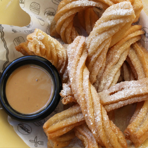 El pan que usan en Casa Combi, es un pan amasado, muy suave, de poca manteca, que le da identidad a las preparaciones pero no es pesado ni invasivo, no se roba el protagonismo. Llegaron a una fórmula casi perfecta de la mano de una vecina del sector, por supuesto. Para cerrar, obvio que tenía que ser de manera dulce. Churros con salsa de manjar fue la elección y los compartimos con Álvaro y Cristián para seguir conversando de las ideas de Casa Combi.
