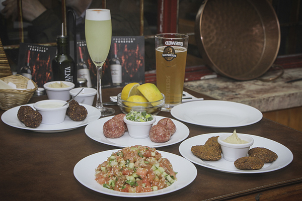 Una cerveza fresca ideal como aperitivo y también ideal para probar los primeros bocadillos que nos presentan, un fresco y muy sano Tabulé (tomate, pepino, perejil yburgol), Kubbe crudo (bolitas de carne cruda , cebollín y limón), Kubbe frito (bolitas de carne frita) con salsa de ají verde, pequeños Falafel (croquetas de garbanzos molidos fritos) con humus de garbanzo.