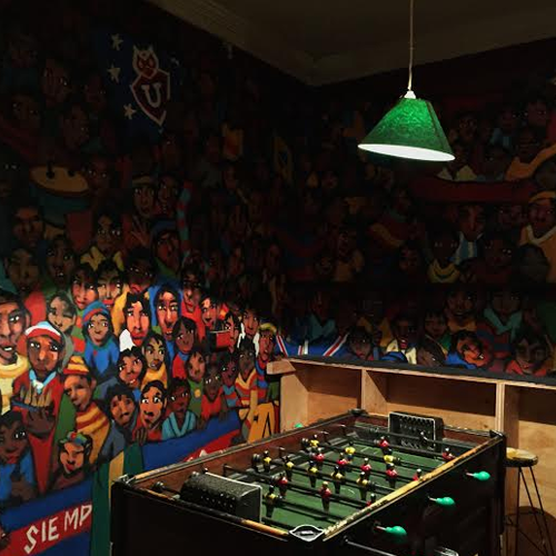 El segundo piso es el más solicitado por los visitantes, sobretodo quienes tienen niños porque jugar taca taca esperando la comida se transformó en la entretención de esos minutos con hambre con unos espectadores en primera fila, atrás hay un mural con hinchas de todos los equipos que miran atentamente el partido.