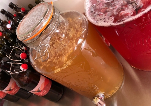 Luego del primer proceso de fermentación, en el que el té dulce se transforma en Kombucha, realizamos una segunda fermentación en la que utilizamos frutas y hierbas para lograr sabores más complejos. Actualmente ofrecemos 4 sabores: frutos rojos con jengibre, manzana con canela, lavanda e hibisco.