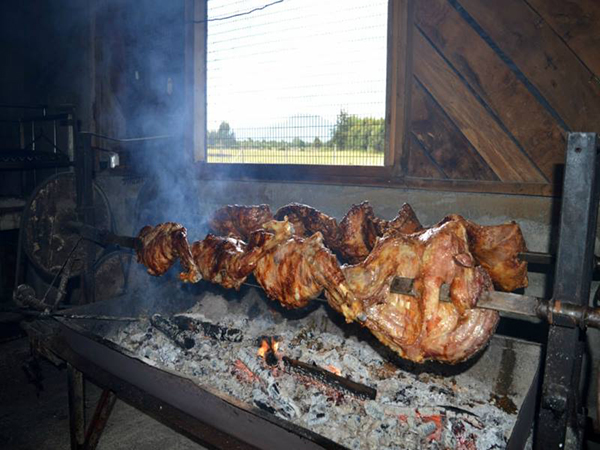 La casona cuenta con un amplio salón comedor con grandes ventanales que enmarcan los paisajes de bosques y volcanes. El buffet de carnes es de distintos tipos: vacuno, cerdo, pollo y cordero, todas con un paciente tratamiento de cocción y ahumado a las brasas del Tepú,una madera cuidadosamente seleccionada según sus propiedades: una brasa duradera sin tanto desecho, para darle a las carnes un sabor y un ahumado perfecto que toma varias horas, pero que valen totalmente la pena. El resultado son carnes de textura muy suave, sabores equilibrados entre la carne y el ahumado particular que le otorga la madera, el tiempo y el cariño del maestro asador, don Miguel Mancilla.