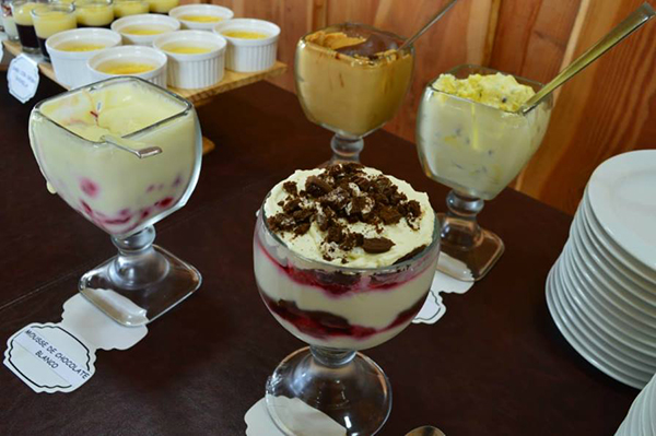 Tartas, mousse, tiramisú, leche asada, tres leches, pannacotta y, por supuesto, postres con ingredientes que son originarios de esas latitudes como los kuchens, el pastel de manzana, los frutos como la murta, las frutillas y arándanos. Una recomendación especial es a que prueben el sagú con vainilla, preparación hecha a partir de perlas de sagú (tapioca o mandioca, que se obtiene de la raíz de la yuca), maceradas con vino tinto combinadas con una crema de vainilla, un sabor y textura muy original