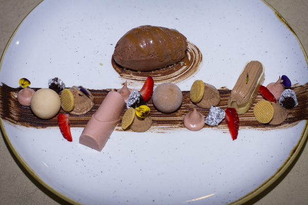 Sin darnos cuenta nuestra vista ya esta hacia el sur oriente de la capital, estamos casi dando la vuelta completa pero aun nos queda el postre y esta muy difícil la elección, el factor chocolate nos ayuda a decidir y pedimos la “Sinfonía de Chocolates” un postre lleno de geometría, diversas figuras con diversos tonos y sabores de chocolate, una real sinfonía.