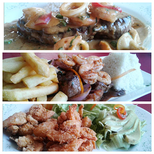 Luego quisimos comer 2 preparaciones estrella de la casa, ambas de carne roja. Una de ellas el Filete Mar y Tierra: exquisito y blando filete bañado en salsa de calamares, y el otro fue Lomo Saltado Acholado, un sabroso plato de un corte muy blando, pero que se diferencia de los otros típicos y criollos por sus camarones más sus correspondientes guarniciones de arroz y papas fritas bien cocinadas.