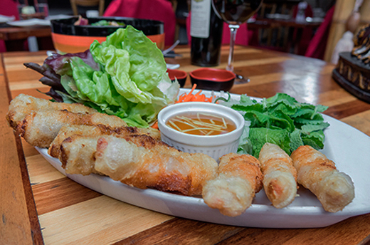 Una de las recomendaciones como plato de entrada fue Cha giò (“Nem” de verduras, cerdo y/o camarón). En vietnamita Cha Gio, significa literalmente rollo de cerdo picado, pero uno siempre puede darle el relleno que desee, en este caso se hace con las verduras y el camarón. En Vietnam se usa muchísimo como plato de entrada. Lo fantástico de los nems es la forma como se sirven, se toma una hoja de lechuga, se coloca el Nem sobre ella en conjunto con hojas de menta, zanahoria y pepino rallados y se forma un arrollado, el cual se humedece en Salsa Vietnamita (exquisita salsa agridulce de pescado al estilo vietnamita, una verdadera delicia). La textura de los nems es distintiva y su sabor es fresco, salado, ácido y suave a la vez. El papel de arroz en el que se envuelve se torna crujiente y al freírse se forman unas pequeñas burbujitas que les aportan cierta ligereza. Este plato estrella de la cocina vietnamita, es nuestro plato elegido como “el mejor plato de entrada” en el Vietnam Discovery.