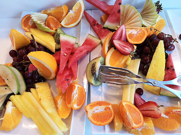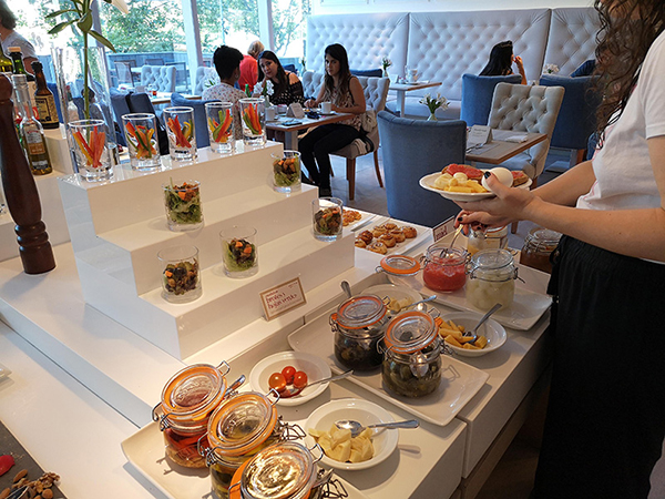 El hotel NH Collection Plaza Santiago se encuentra en pleno barrio “Sanhattan”, en la comuna de Las Condes y muy cerca del límite con Vitacura. En su moderno edificio cuentan con un restaurante y comedor principal – el “Abras”- donde se ofrece un completo servicio de desayuno tipo buffet que cuenta con estaciones de platos calientes y fríos, recetas típicas del norte, centro y sur de Chile, mucha variedad de frutas, dulces y lindos postres en miniatura. Además tienen embutidos, curtidos y causeos para complementar la oferta culinaria matutina.