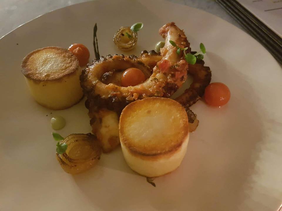 En esta oportunidad especial, rodeadas de un marco arquitectónico privilegiado, probamos platos distintos, con sabores poco usuales. Por este motivo, iniciamos con el plato que más aplausos alcanzó: Cochinillo confitado sobre tortilla de rescoldo acompañado con salsa chancaca y ají cacho de cabra. Es la primera vez que probaba esta mezcla tan exótica de sabores que conjugaron de manera perfecta. La porción es adecuada y la presentación sencilla, pero no menos sofisticada. Continuamos con un Pulpo marinado en chancho en piedra, acompañado de papas confitadas y láminas de perla glaseada. En lo personal, he probado muchísimas veces el pulpo cocinado de distintas formas, pero en esta ocasión destaco que el pulpo se degustaba suave y cremosamente en la boca, siendo un manjar para paladares delicados.