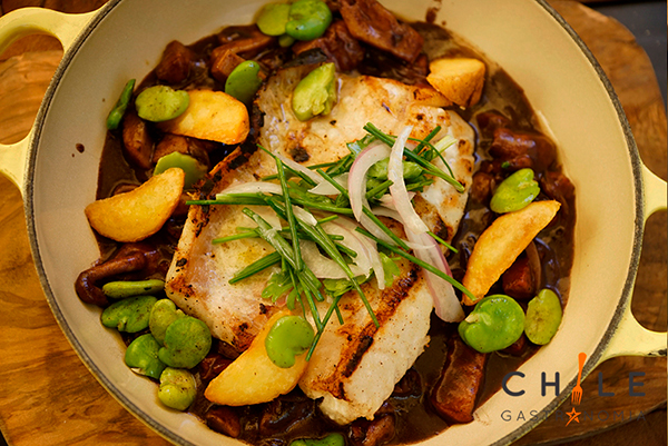 Su carta, muy bien diseñada y en donde destacan las bondades del mar de Chile, te invita a querer descubrir entradas como sus locos con timbal de papas, tataki de res al estilo oriental, camarones ecuatorianos para luego pasar a los platos iconos del chef: chupe de centolla, gratinado de merluza con espinacas, estofado de congrio con reducción de vino tinto y vegetales.