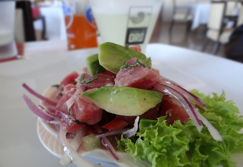 La experiencia Aristos, comenzó con un refrescante y vigoroso Pisco Sour a la rica-rica (Hierba medicinal altiplánica) justo y necesario a esa hora del almuerzo, con las temperaturas y aridez de la ciudad. Siguiendo el consejo del cordial garzón, Enrique, nos dejamos tentar por una Trilogía de Cebiches de Pescados (Corvina, Atún y Salmón) justo en su acidez, sazón y picor. Frescura pura y buena presentación.