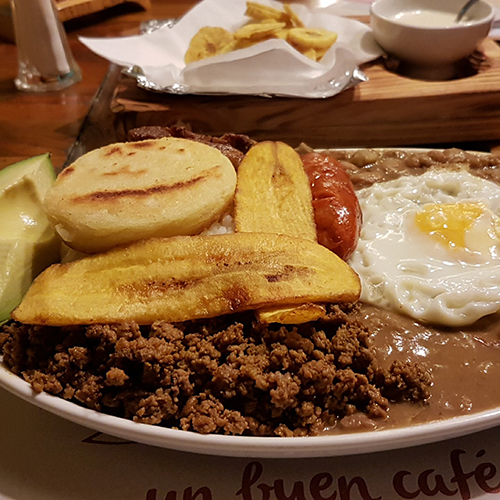 Después de este apronte vino el esperado plato de fondo. Decidí probar uno de los platos más típicos de Colombia: la famosa bandeja paisa. Pocas veces había comido un plato tan contundente y variado en sus ingredientes: carne molida, arepa, palta, frijoles, huevo frito, costilla de cerdo, chorizo y más plátano frito. Casi me caigo de espaldas cuando veo todo eso servido en la mesa, frente a mí. A decir verdad, la bandeja paisa estaba deliciosa, con muy buena temperatura, servido en un plato sencillo y sobrio. La mezcla de colores hace aún más sabrosa esta preparación pero les advierto que deben tener mucha hambre si realmente pretenden no dejar rastros de comida.