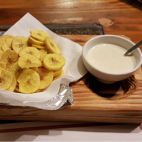 Antes de pensar en lo que comería, amablemente me ofrecieron una linda “Entradita de monedas”, que consiste básicamente en pequeñas rodajas de plátano frito acompañadas de una maravillosa y adictiva salsa de ajo. ¡Delicioso picoteo para preparar el apetito! Cabe destacar que todas las personas que atienden, cocineros incluidos, son colombianos.