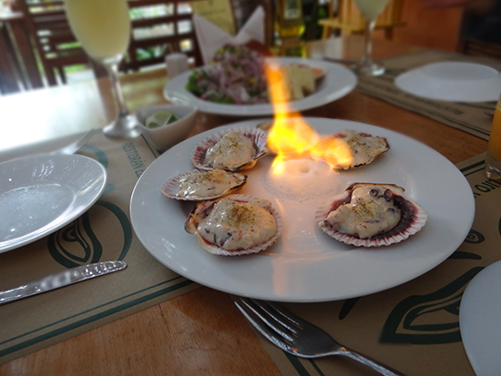 Siguió el abordaje con unas Brochetas de Corvina acompañadas de su camote asado y salsa huacatay, si pensábamos que los ravioles eran magnánimos, este plato se lució por sí solo. Y por su lado dos platos estrellas la Lasaña de Verduras y los Ostiones a la parmesana.