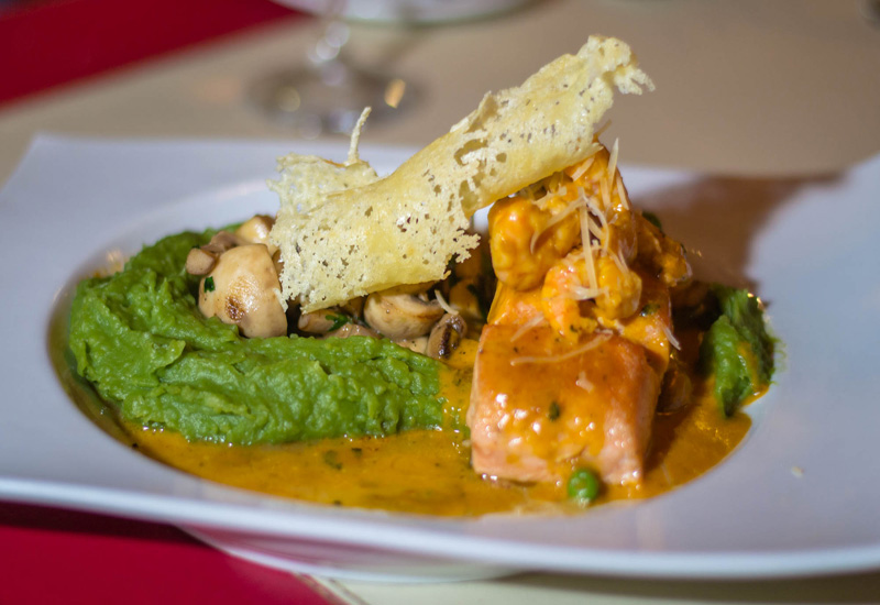 La 2° etapa de la degustación, constó de tres preparaciones calientes, creadas por el joven chef, Denis Walter, quien fue aplaudido por quienes estábamos presentes, sorprendiéndonos con el tradicional Lomo Saltado, más un Filete de Salmón, con un maravilloso puré de espinaca y champiñones salteados.