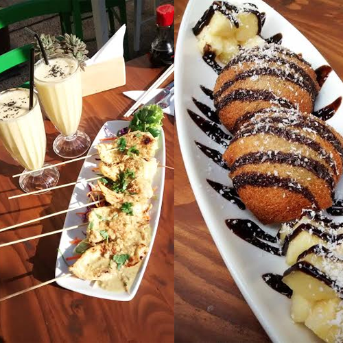 Mientras conversábamos con Pablo, acerca de la vida de Quai Thai, Felipe amablemente se encargó de atendernos como si estuviéramos en casa, invitándonos a probar un batido con el cual quedamos maravillados: Mango Thai (mango+leche de coco+sésamo), el cual acompañó a una, sin exagerar, magnífica entrada: un Saté de brochetas de pollo con curri, leche de coco y maní, acompañado por un salteado de verduras. Esta entrada no me cansaría de comer y comer.