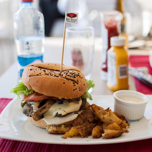 Y para los vegetarianos o los que prefieren mantener la línea, que a veces se sienten excluidos por los restaurantes. Roof Burger también pensó en eso y creó la Veggie Burger con cebolla, champignones, pimientos salteados, tomate y lechuga. Pero si piensan que van a quedar con un poquito de hambre, TODAS las hamburguesas van acompañadas con papas rotas y sour cream.