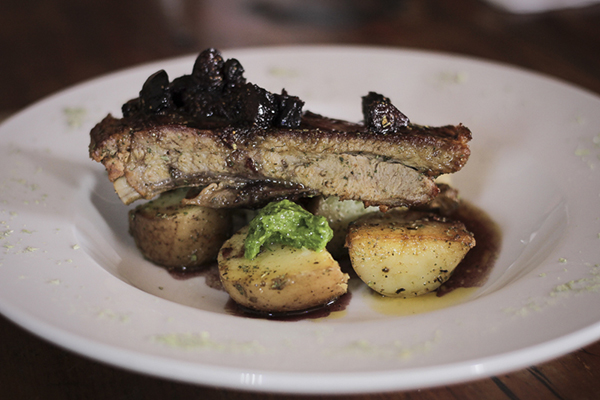 Es en este momento en que me entero que lo que estoy probando es el menú del día y que ahora me correspondía el plato de fondo, un delicioso Costillar de Cerdo al horno adobado en una salsa merlot con higos, acompañado de unas papas horneadas, aliñadas con sal de cachayuyo que es un arbusto que se da en el desierto de atacama.n plato que podría ser la estrella pero que para la suerte de muchos esta en el menú.