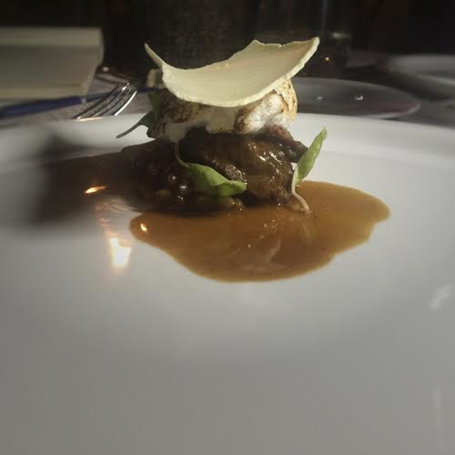 Un blend de Cabernet Sauvignon – Petit Verdot – Syrah y Carménère Aluvión de Lagar de Bezana acompañaría nuestro plato de carne: Carrilleras de vaquilla. Las carrilleras son un corte de la quijada de la vaca y estaban acompañadas de risotto de mote, nube agridulce y crocante de leche. Absolutamente recomendable. Es un plato con un sabor muy particular y con personalidad propia. Al comer los ingredientes juntos dan la sensación de estar comiendo a la vaca completa, desde su leche a la carne y descubriendo texturas, capas y sabores. Un plato de alto nivel.
