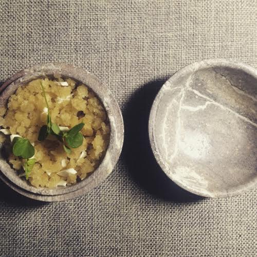 Tras las potentes carrilleras, era necesario un descanso, y como si leyeran mi mente nos trajeron una redonda y esculpida piedra fría y en su interior un Chevré de Chirimoya con Queso de Cabra. Simple, pero exquisito. El queso de cabra le suma cuerpo y densidad al Chevré de Chirimoya. En la primera cucharada de este refrescante plato se siente la chirimoya, luego al adormecerse la lengua da paso a sentir el queso de cabra.