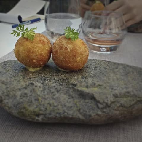 Primero nos trajeron un Sauvignon Blanc Litoral de Viña Ventolera, perfectamente servido en su temperatura, listo para acompañar nuestro primera entrada: Croquetas de Piure.