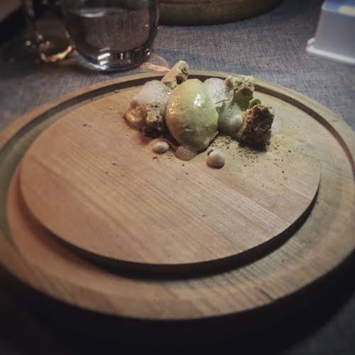 La presentación de este postre es perfecta: una cúpula de vidrio mostraba en su interior este postre cubierto por humo y vapor. Angelo Pollini nos explicó que en sus investigaciones y paseos con el equipo observaron que nuestras costas de la zona litoral tienen muchos eucaliptus, lo que inmediatamente me hizo vincular con el aroma del local al entrar. Destapó el postre, un Dacquoise de Nueces, crema de queso y miel de tebo, con reducciones de eucaliptus y limón, acompañados de helado de lúcuma y el aroma se apoderó de todo el espacio. Nos invitó a comer con la mano.