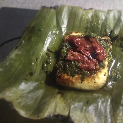 El siguiente plato no estaría bajo los anteriores: Humitas de queso fermentado y gratinado, marinado con pesto y tomate, envueltas en hojas de plátano. Matías, con un soplete, abrió esta humita. ¡Sorpresa! En su interior se encontraba esta amalgama de sabores y colores que combinaban perfectamente.