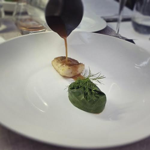 De carne muy tierna y suave, estaba acompañada de un puré de coliflor envuelto en acelga, verduras y un caldo de sus espinas especiado con ají cacho de cabra. El caldo era muy sabroso, con una suave textura aterciopelada, lo que daban ganas de tomar un plato sólo de éste.