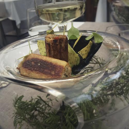 Siguiendo nuestro recorrido por nuestras costas nos trajeron un plato simplemente encantador. Rollos de sierra ahumada acompañadas de pasta de papa nativa, ajo negro de Chiloé, emulsión de palta y crocante de yuca y cilantro. Estos rollos reposaban sobre un lindo plato de vidrio donde en su interior se escondían ramas de espino aparentando ser un bosque encantado. Hay que destacar lo bien trabajado que estaban los crocantes de yuca y cilantro; de grosor delgado y muy crujiente.