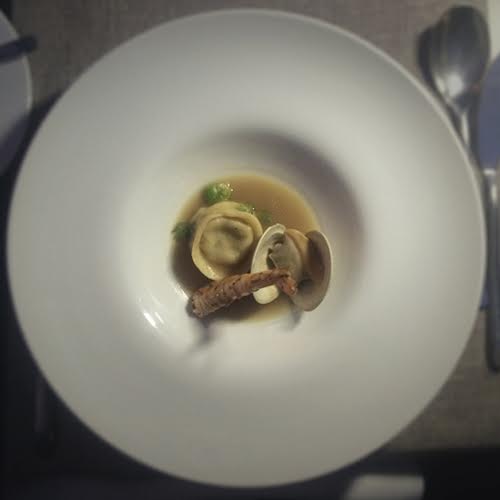 Luego, que en su centro reposaba una almeja y un tortellini relleno de lapa y jaiba acompañado de camarones grillados y caldo de lapa con fina textura bechamel. El caldo aportaba una suave estela cítrica que mezclaba perfectamente los sabores.
