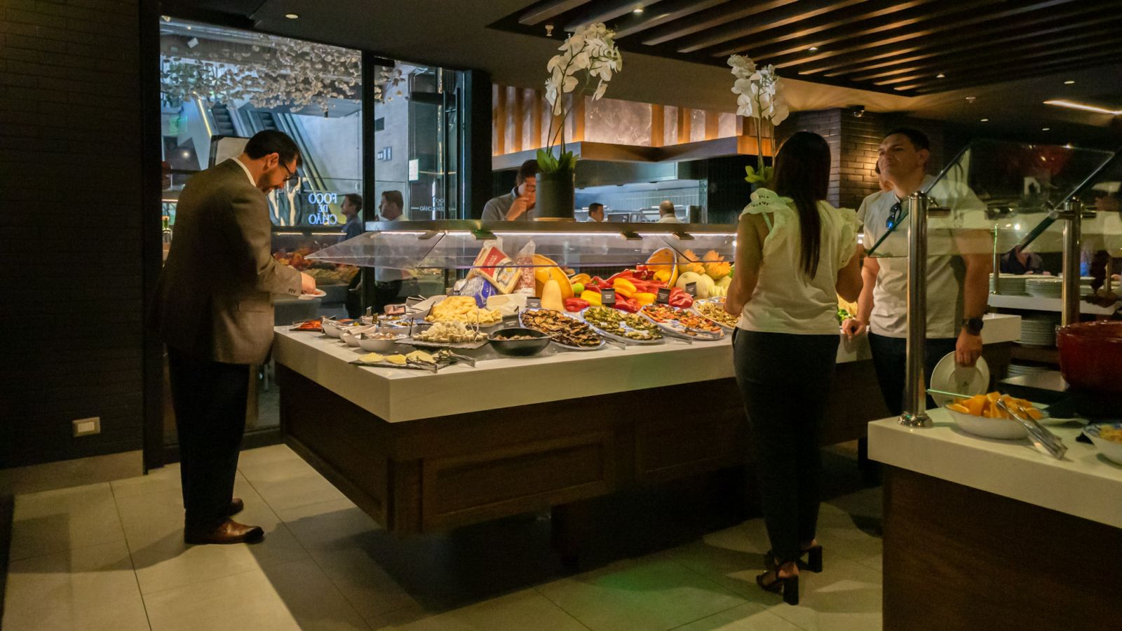 existe una Mesa de Mercado de ensaladas y acompañamientos que cumple un rol estratégico: refrescar el paladar, aportar acidez y descanso entre ronda y ronda. Hay vegetales frescos, quesos, charcutería, preparaciones tibias y pequeños guiños a la tradición brasileña.
