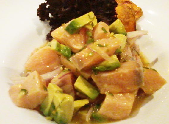 Y, finalizamos con un maravilloso y contundente Ceviche de Salmón, con leche de tigre al tamarindo, apio, cebolla morada, palta, cilantro y camote frito. Fabulosa preparación que no pasa desapercibida.