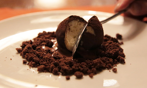 Para finalizar, la presencia de la trufa en los postres también tiene su protagonismo. Probamos el granizado de manzana con miel trufada, servido en copamartinera con una base de helado. Y una especial sorpresa es el original “Arroz con Leche” trufado, especialmente creado para esta carta, envuelto en una bola de chocolate amargo y acompañada de una cama de brownie. Todo un conjunto que sorprende desde la vista hasta el paladar.