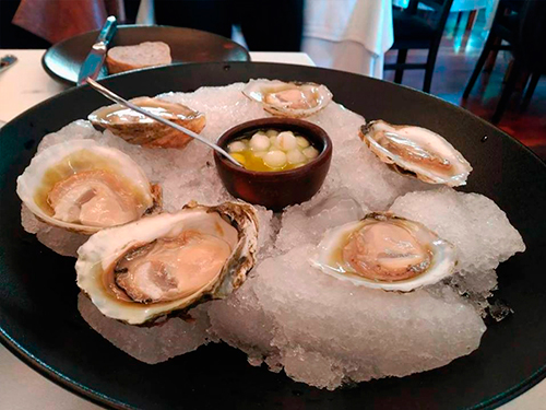 Mi primera elección (para las entradas) fueron ostras con caviar de pepino, presentadas en una cama de hielo y con unas bolitas de pepino maceradas en jugo de limón. La segunda elección, fueron locos acompañados de finas láminas de cebolla y papa los cuales me sacaron del contexto tradicional de los clásicos locos, por su exótico corte. Todo acompañado con un Sauvignon Blanc Amayna, de la viña Garcés Silva.