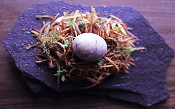 Sabíamos que la esencia de Kütral era la Cocina Chilena de Autor, pero lo que no sabíamos era el poder que esta tenía. Partimos la experiencia con una de sus mágicas obras: “El Nido de Camarones” esta es una entrada que te deja observándola, el mensaje es inmediato, te invita a querer descubrirla y entenderla. El protagonista es un huevo curado en calafate y chardonnay, es una especie de huevo pochado pero se hace con cáscara, y a través del proceso queda con cicatrices tinturadas, lo que le da un aspecto misterioso y muy atractivo. El huevo está montado sobre papas al hilo, mousse de palta, alioli, toques de hinojo, sal del Himalaya, y los camarones escondidos en esta mixtura de sabores. Sin duda este montaje transformo el plato en el atril de un pintor.