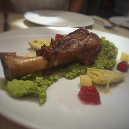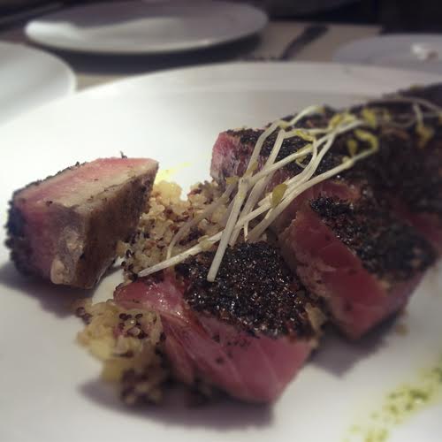 Luego nos aventuramos con un garrón de cordero confitado de Puerto Natales sobre un puré de arvejas y corazones de alcachofas con dados de papas fritas y gelatina de chicha. El garrón, si bien es un carne muy fuerte, quedaba en perfecto equilibrio al estar confitado y con el sabor neutral de las arvejas. Qué decir de la gelatina de chicha…increíble! Un sabor que le daba una nota particular y dulce al plato. Para hacer la contra parte de los fondos pedimos un atún de aleta amarilla, cubierta de algas y pesto de avellana sobre quínoa cremosa. Un plato refrescante para estos días de calor.