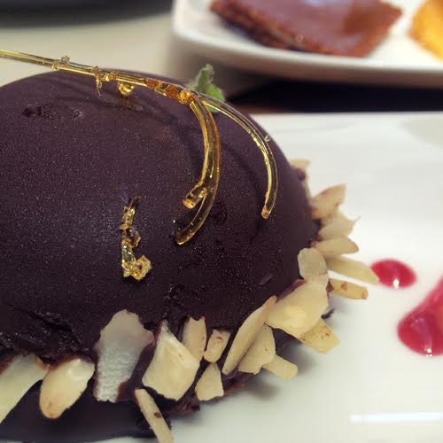 Para terminar nos deleitamos con “Texturas de Noi” que consistía en un panzotti de caramelo y almendra, relleno de chocolate blanco y romero –qué buen acompañante siempre es el romero– helado de naranja jengibre y macarrón de frutilla con crema cítrica. Una chispeante combinación. Pero también pedimos un postre cálido y denso, sólo podía ser de chocolate: “Media Esfera de Chocolate”. Esta generosa forma geométrica estaba rellena y acompañada de fetuccini de papaya y coulise de limón. Todo fanático del chocolate debe terminar con este postre.