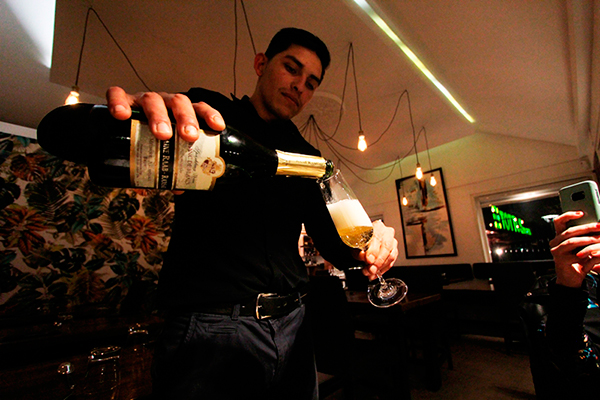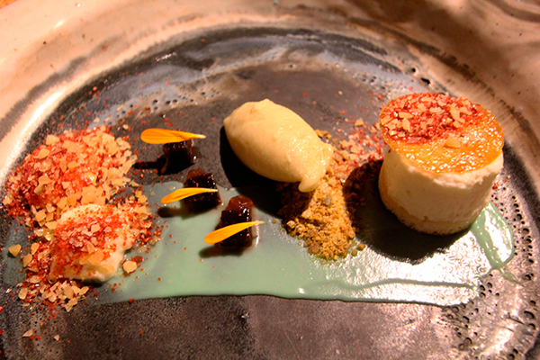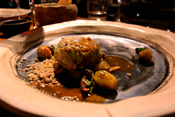 Domaine Raab Ramsey, Blanc de Blancs Brut, uno de los espumantes más interesantes de Chile. Dentro de este viaje, encuentras una fina selección de vinos chilenos, muy bien escogidos para cada obra del chef. Dentro de las preparaciones destacamos sin duda uno de sus fondos: "Choux Farcis" de Cordero Lechón sobre Salteado de Champiñon Silvestre de la Región de Futrono, acompañado de un bien elegido