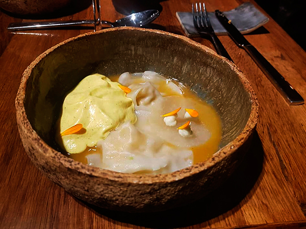 Atendido por un sommelier y un mesero especializado (a) este viaje comienza con un “Ammuse Bouche» estos son diferentes de los aperitivos, ya que no están ordenados por los clientes, y se sirven como una atención del chef. En esta ocasión fue una deliciosa Crema de Zapallo Butternut acompañada con un